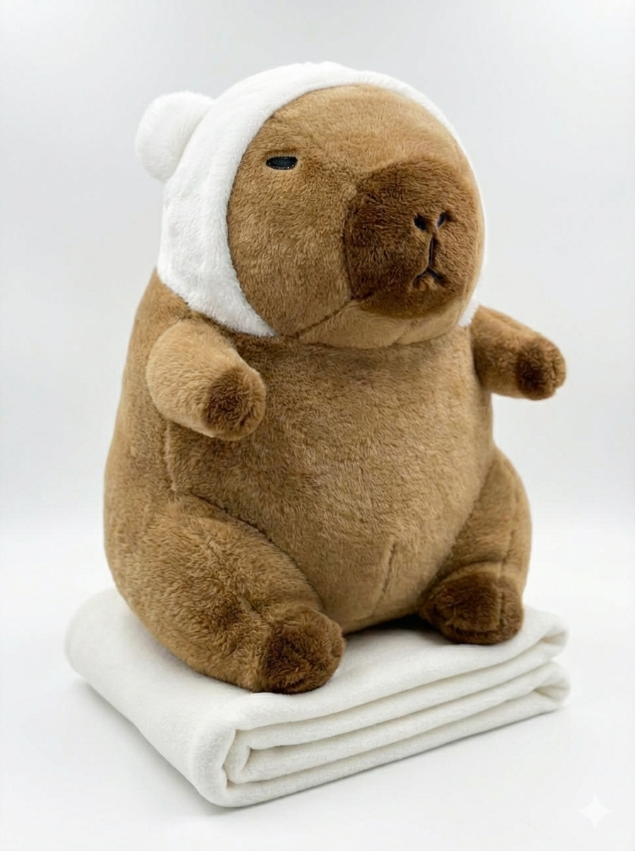 Peluche Capibara "Capu-Hoodie" – Edición con Gorro Blanco + Manta