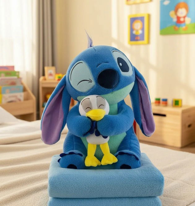 Este peluche gigante de Stitch de 60 cm con su adorable mascota pato y manta incluida es el combo perfecto de juego y confort. Pensado para acompañar a los más chicos en momentos de diversión, descanso y sueño, este set transmite cariño, protección y amistad.