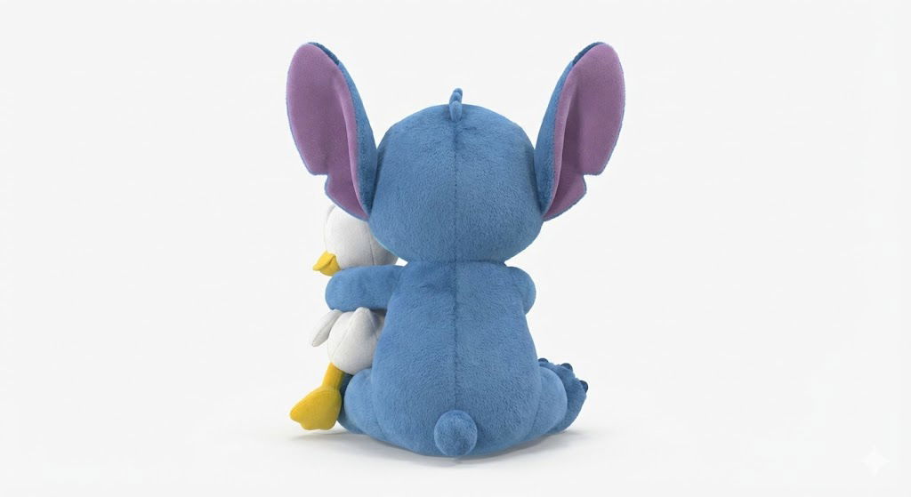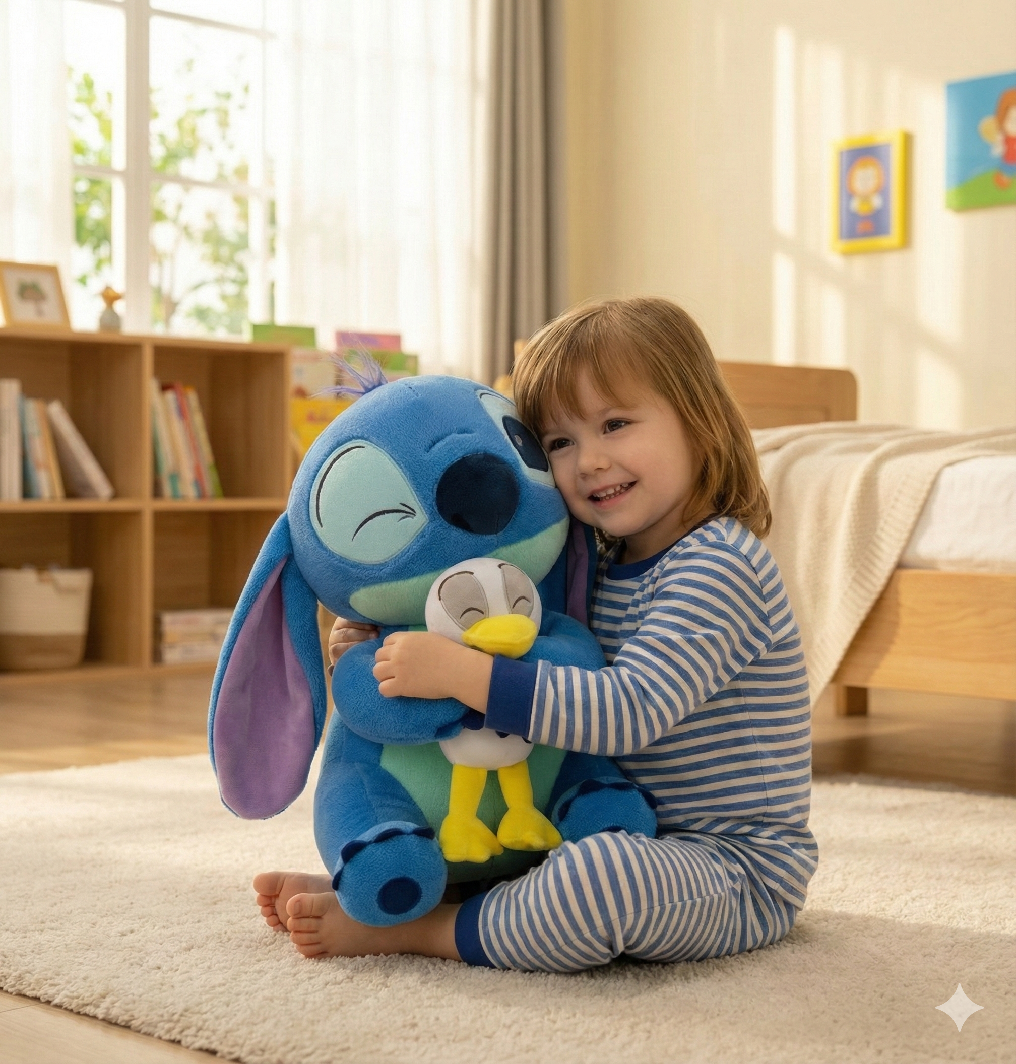 Stitch abrazando a su patito representa amistad y cuidado, invitando a los chicos a expresar emociones a través del juego. La manta suma un plus ideal para momentos tranquilos, viajes o antes de dormir.