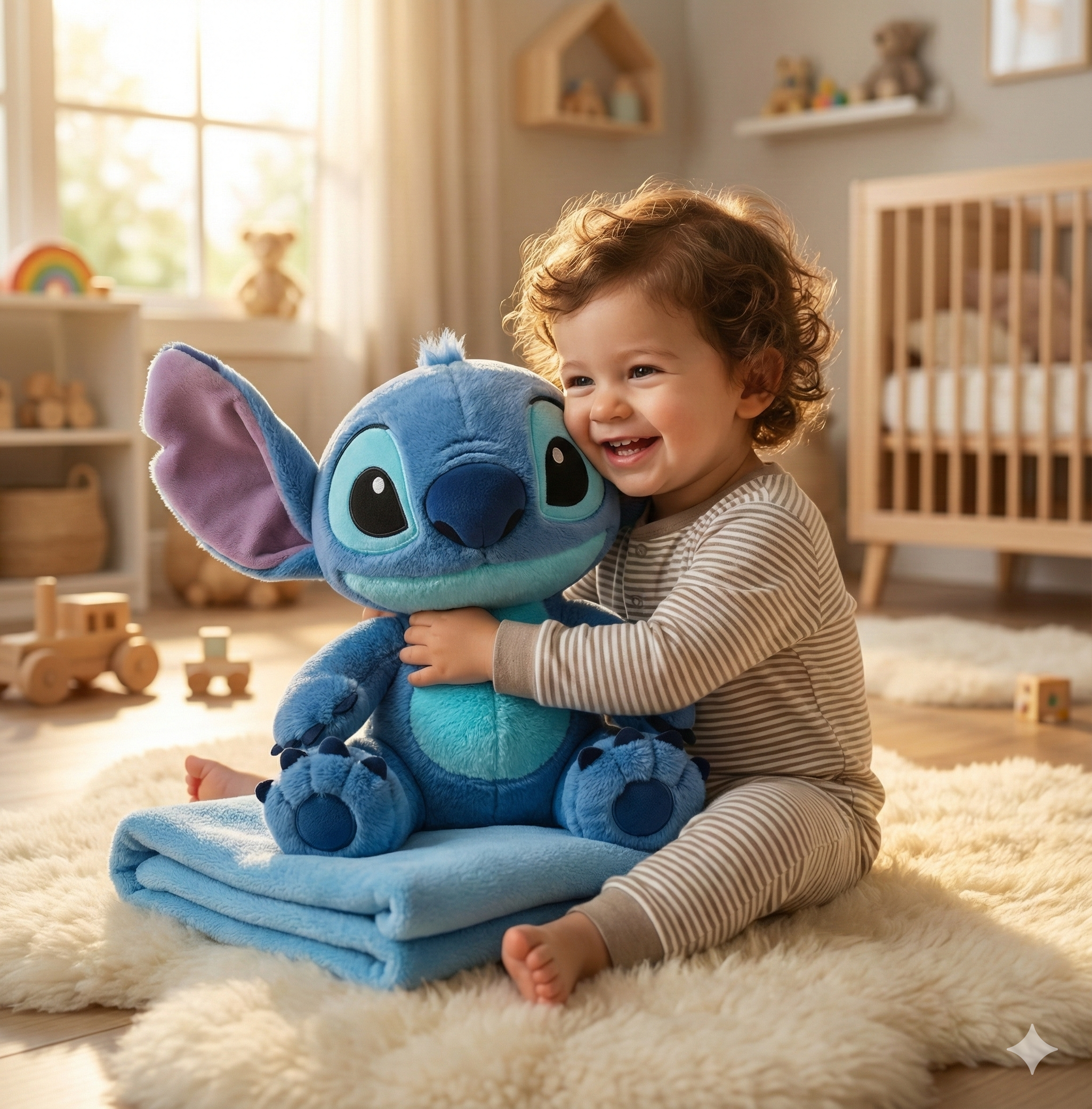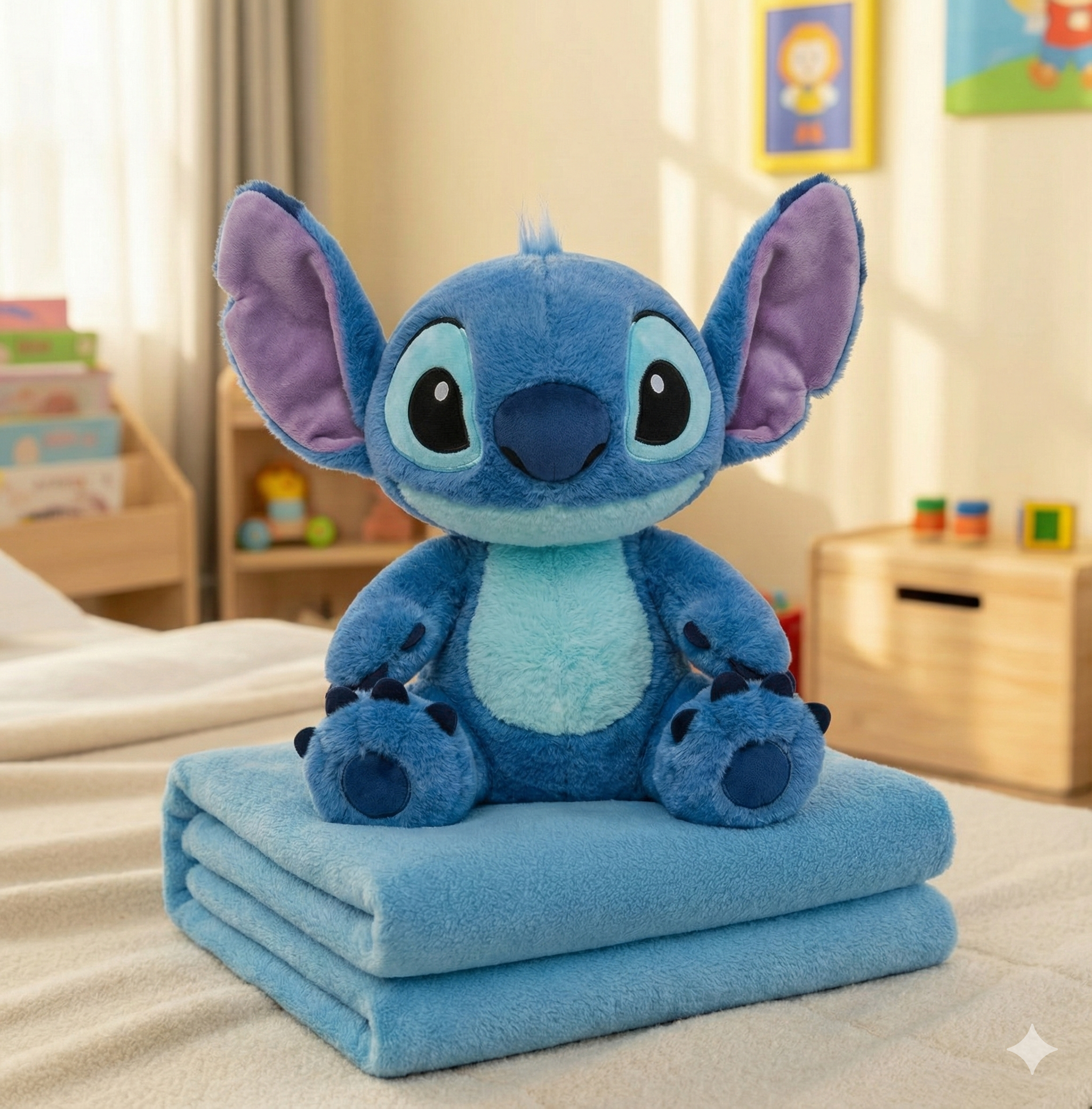 Stitch se transforma en un amigo inseparable para abrazar, mientras la manta acompaña siestas, viajes o noches de descanso. Ideal tanto para el juego como para momentos tranquilos.
